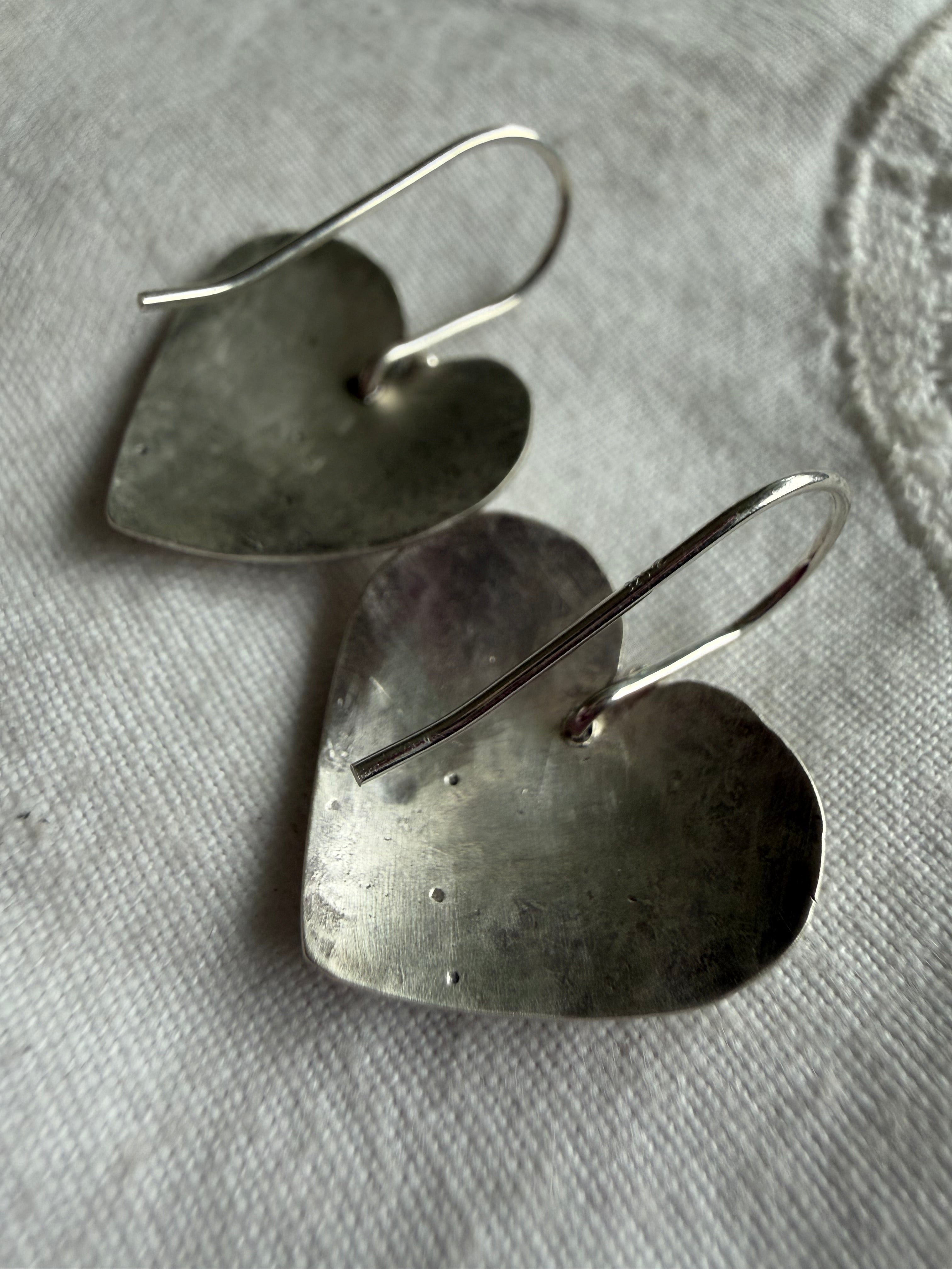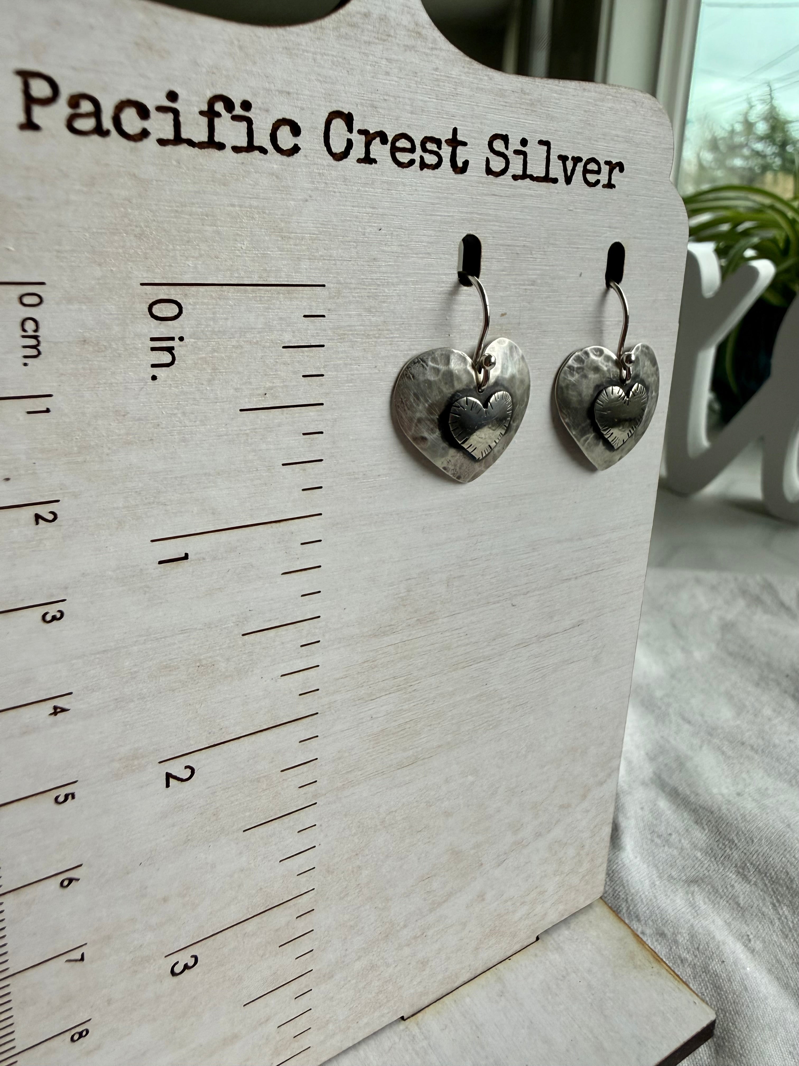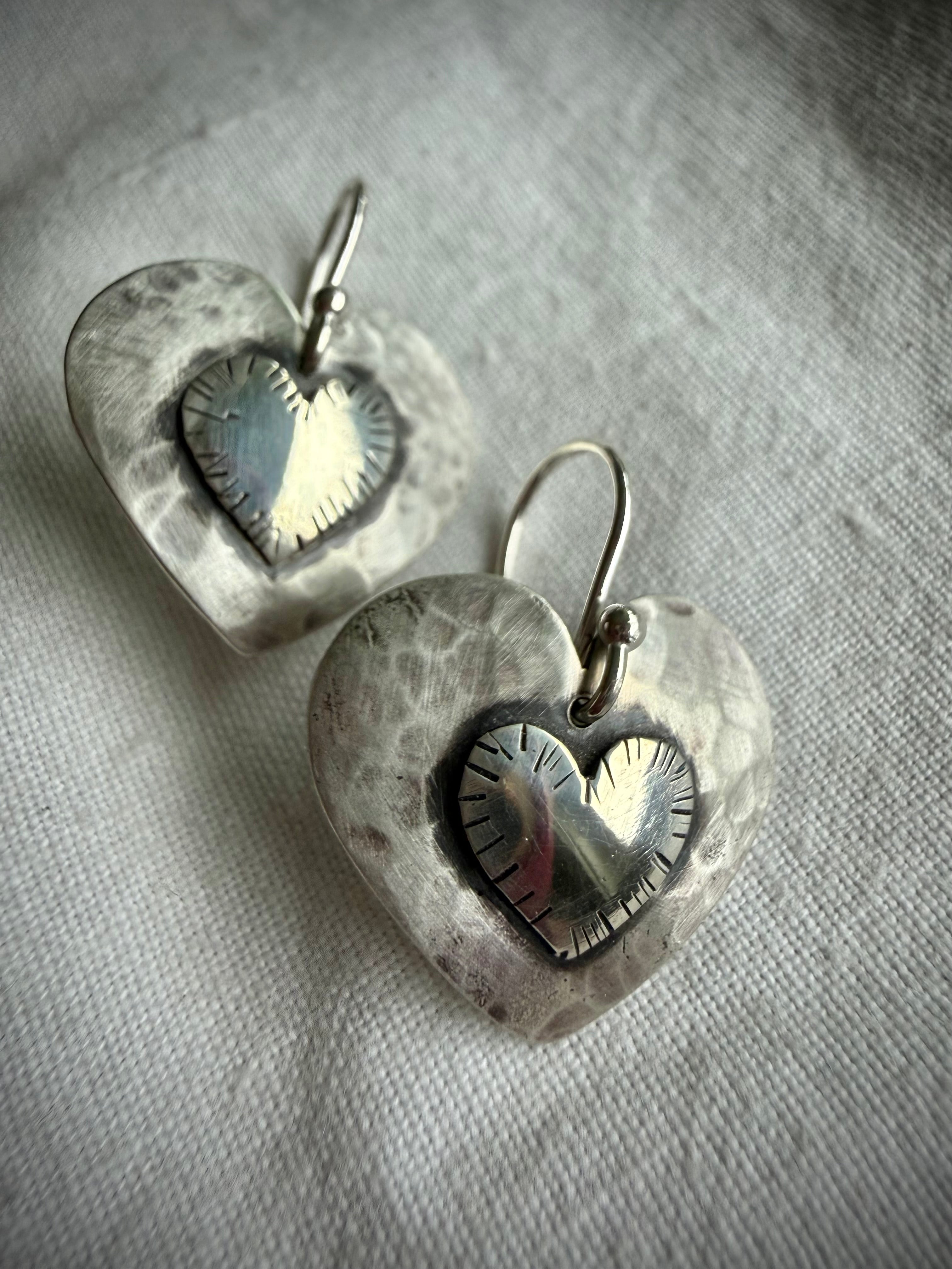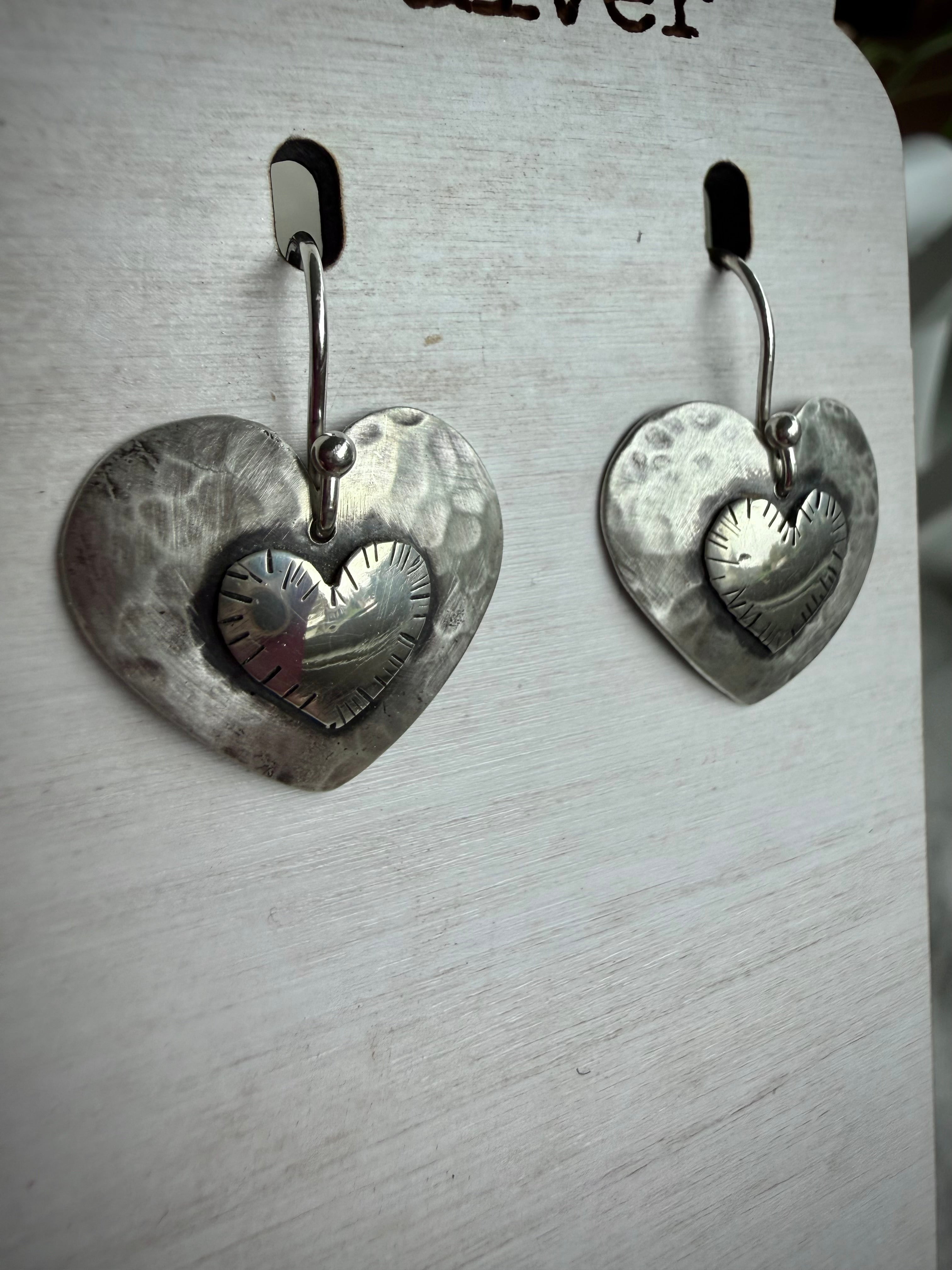 Shape/Design: Small heart soldered to a large heart. Hammered & stamped metal.